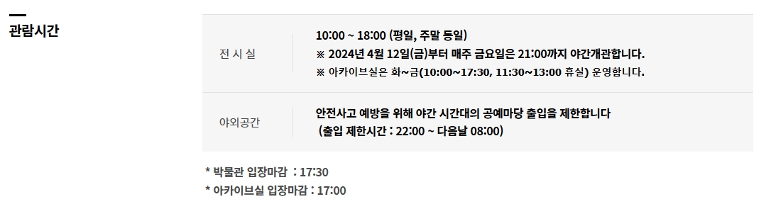 그리고 중요한 점이 또 있는데요, 바로 입장 마감 시간이에요. 박물관 전체 입장은 오후 5시 30분에 마감되고, 아카이브실은 그보다 조금 이른 오후 5시에 마감되니까 늦지 않게 도착하는 것이 중요해요. 너무 늦게 가면 아쉽게 발걸음을 돌려야 할 수도 있으니 꼭 기억해주세요. 야외 공간은 안전을 위해 밤 10시부터 다음날 아침 8시까지는 들어갈 수 없다고 하니 참고하세요.