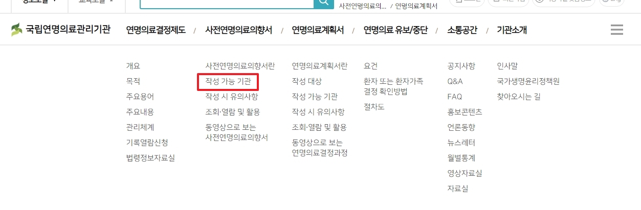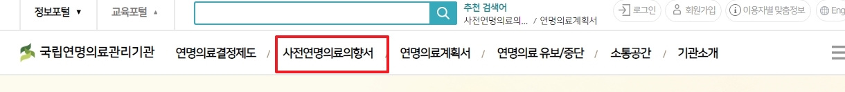 연명치료 거부 사전의향서 작성하는 곳을 찾기 위해 국립연명의료관리기관 홈페이지에 접속했다면, 상단 메뉴에서 '사전연명의료의향서' 항목을 먼저 찾아보세요. 여기에 마우스를 올리면 관련 하위 메뉴들이 나타납니다.