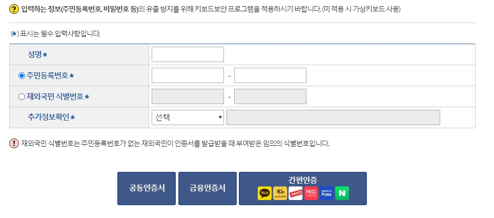정보 입력이 완료되면 준비된 공동인증서(구 공인인증서), 금융인증서, 또는 간편인증을 통해 본인 인증을 완료합니다. 인증서 암호를 정확하게 입력해야 다음 화면으로 이동할 수 있습니다.