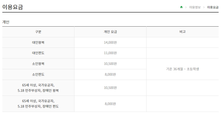 현재 대인 왕복 요금은 14,000원이며 편도는 11,000원입니다. 어린이를 동반하는 경우, 소인 왕복 요금은 10,500원이므로 참고하시면 좋습니다.
