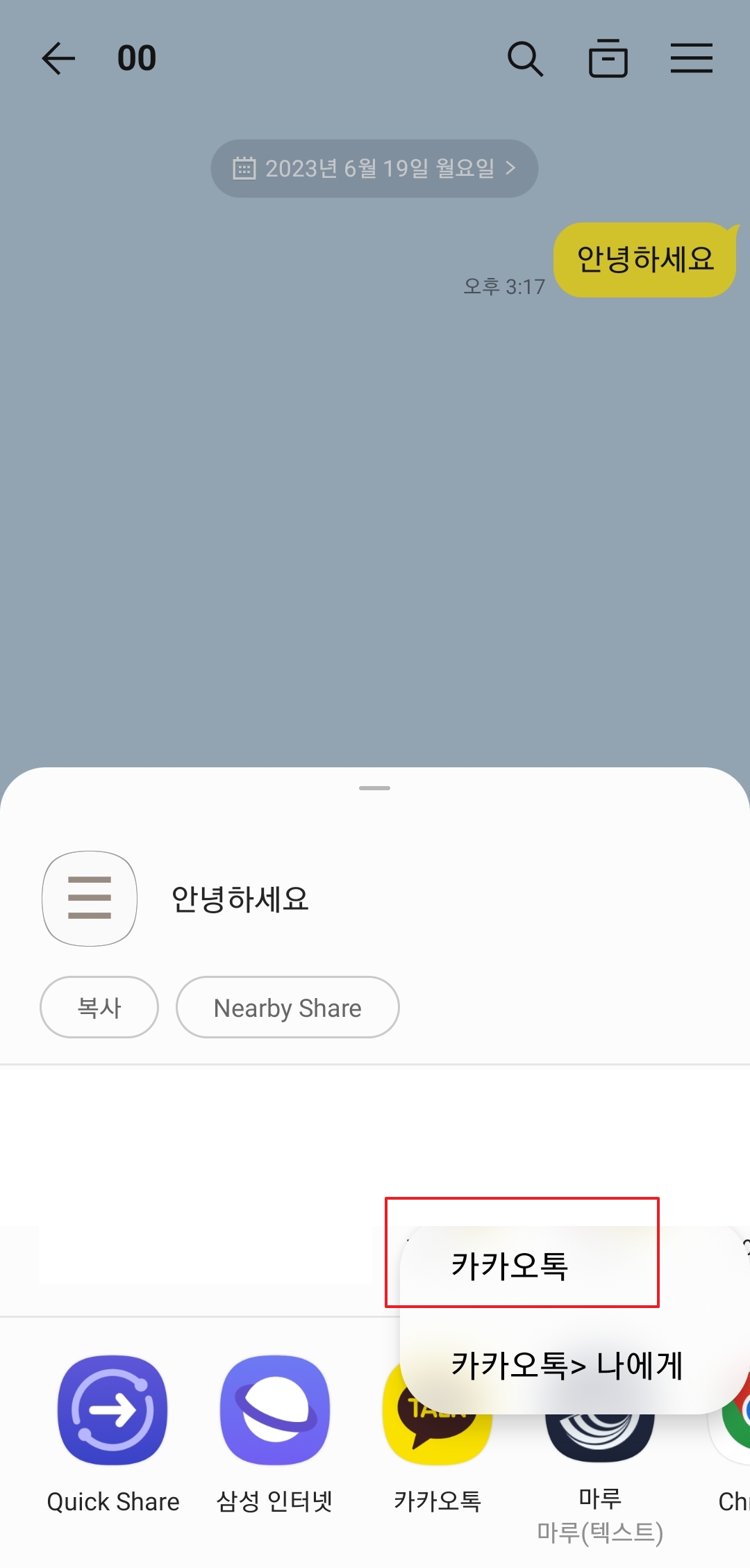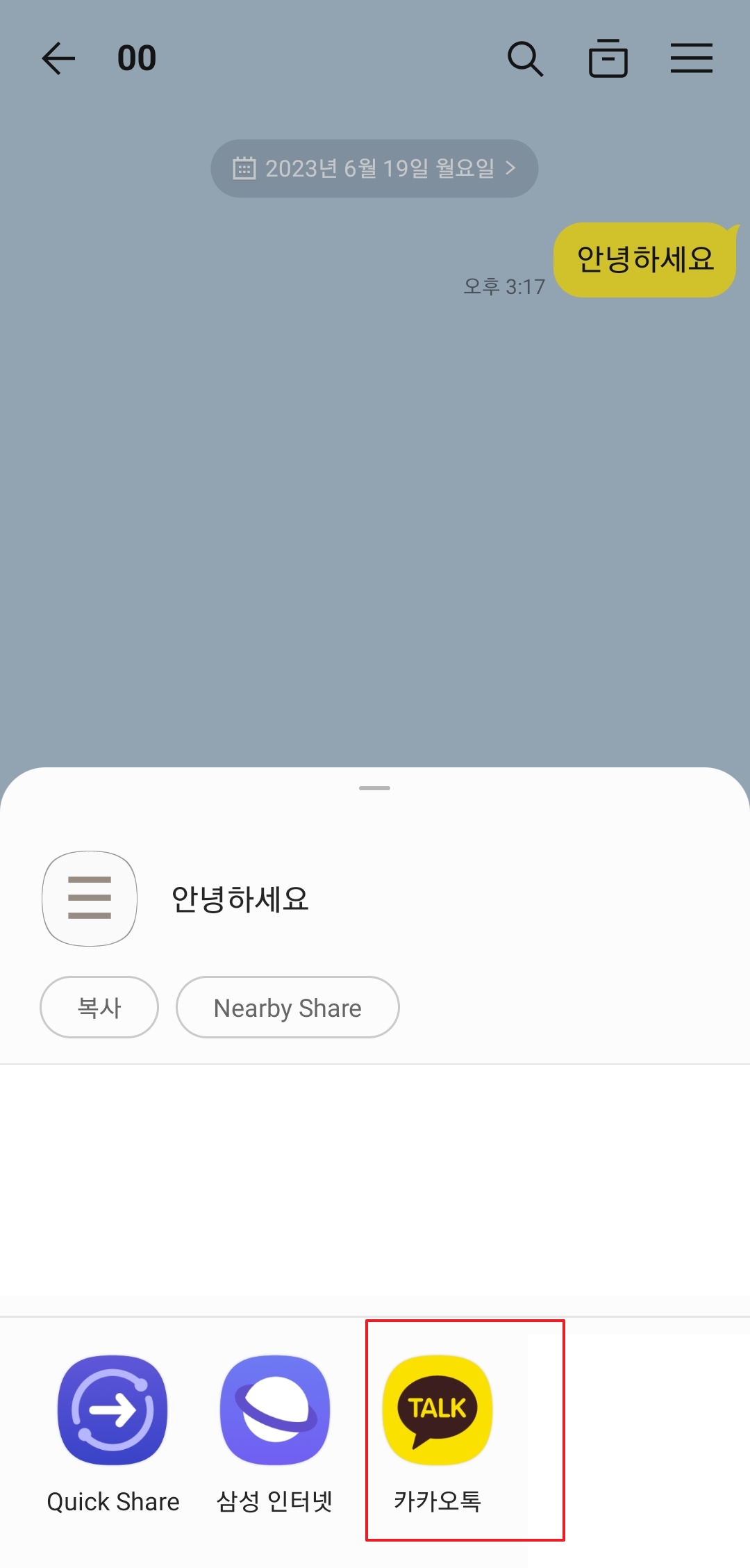 이 메뉴에는 복사, 삭제, 답장 등 다양한 기능이 포함되어 있습니다. 우리가 사용할 기능은 이 중에서 다른 사람에게 내용을 전달하는 역할을 하는 '공유' 기능입니다.