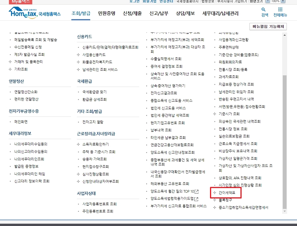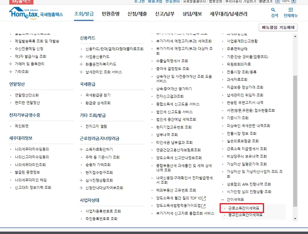 '조회/발급' 메뉴에 커서를 올리면 커다란 상세 메뉴창이 화면을 가득 채웁니다. 우리가 사용하려는 계산 기능은 이 메뉴창의 가장 아래쪽에 위치해 있어, 오른쪽에 보이는 스크롤 막대를 이용해 화면을 맨 아래까지 내려야 합니다.