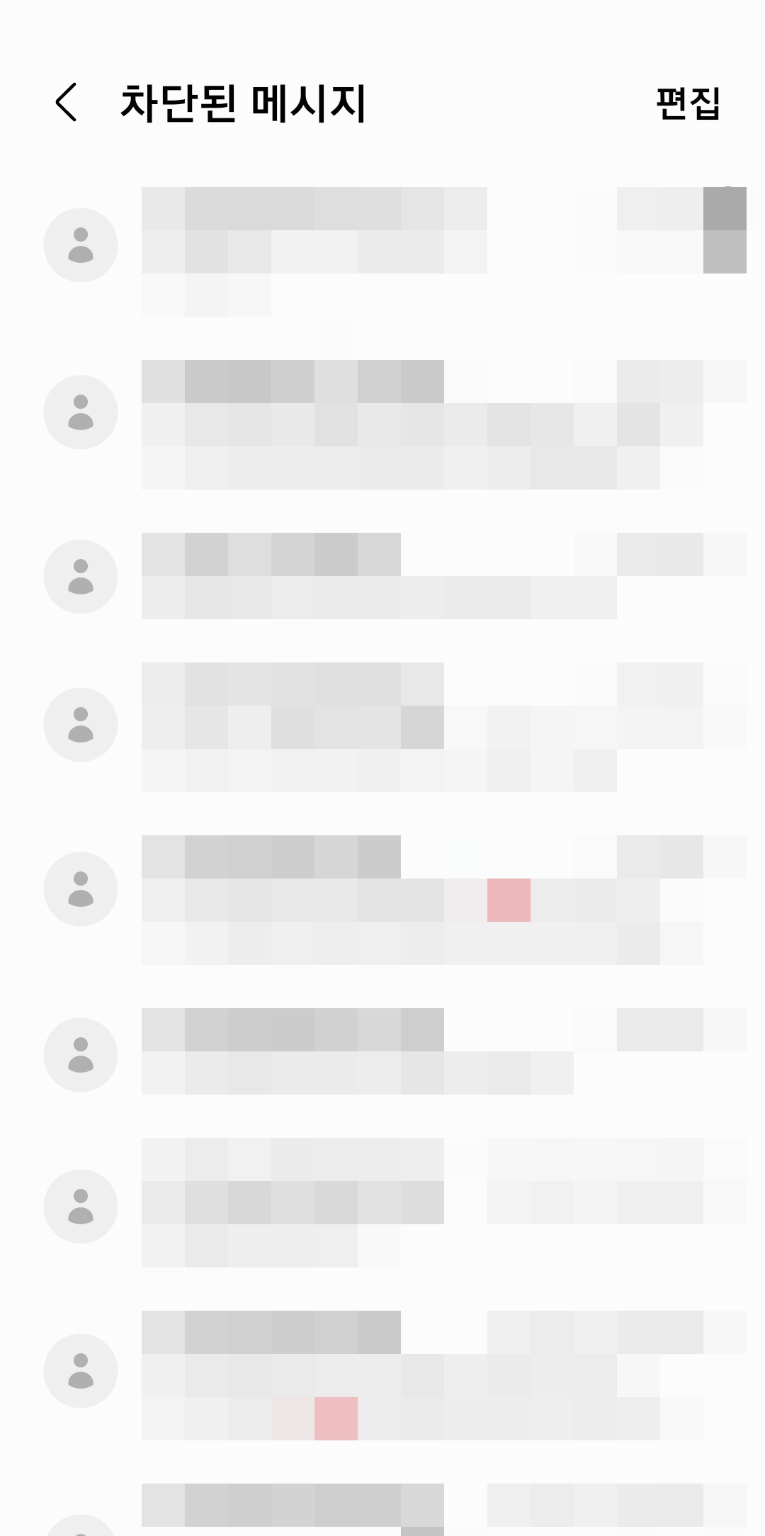 특정 번호의 차단된 메시지 목록으로 들어가면, 대화 형식으로 내용을 볼 수 있습니다. 만약 이 내용들마저 보관하고 싶지 않다면, 화면 오른쪽 위의 '편집' 또는 '삭제' 버튼을 이용해 깔끔하게 정리할 수 있습니다.