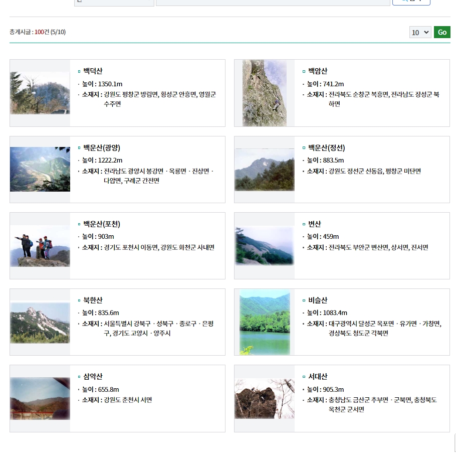 해당 홈페이지로 들어와서 가장 좋은 기능이라고 생각했습니다. 한반도 지도 모양 그대로 100개 산을 표시하면 사실 산이 어디있는지 알수도 없을 정도로 겹쳐 보여서 어디가 어딘지 하나도 구분이 가지 않는데 해당 페이지는 도별로 확인이 가능합니다.