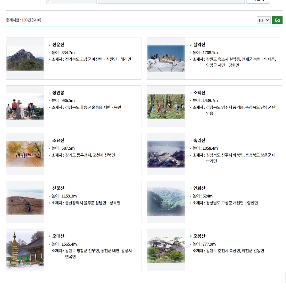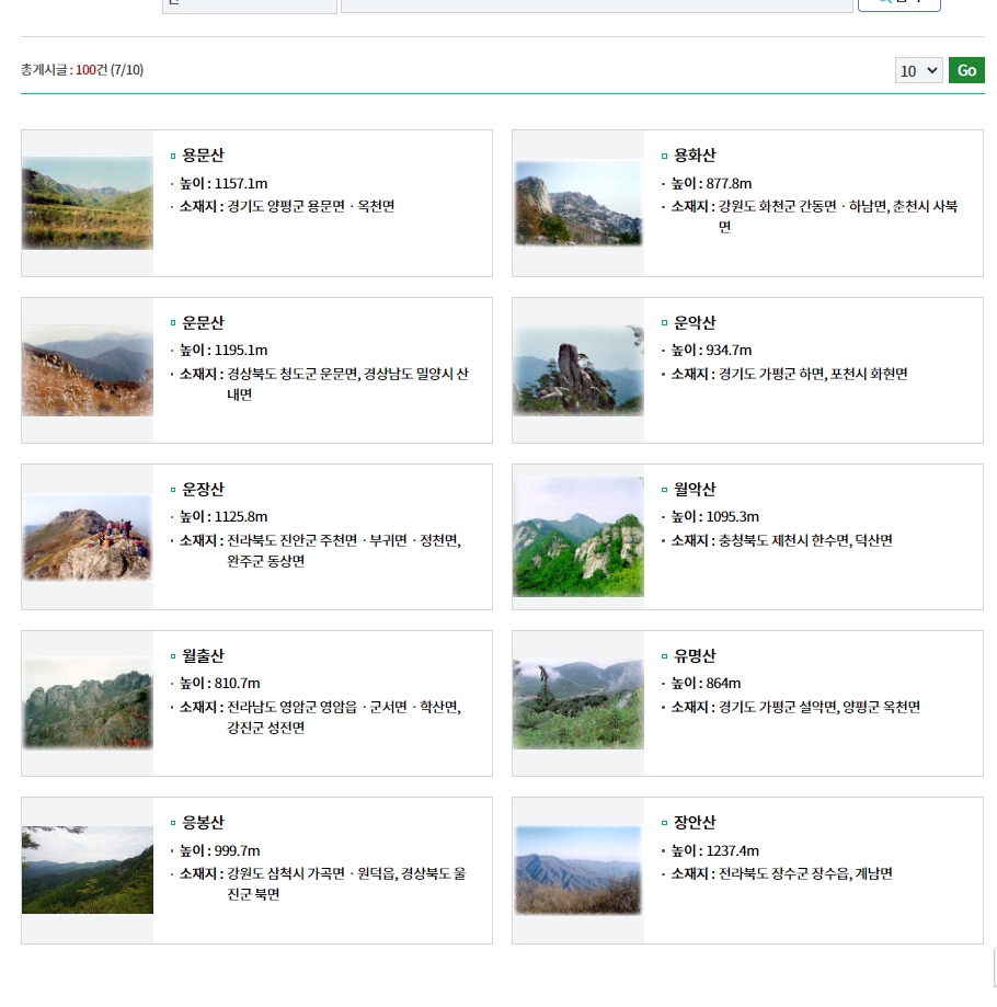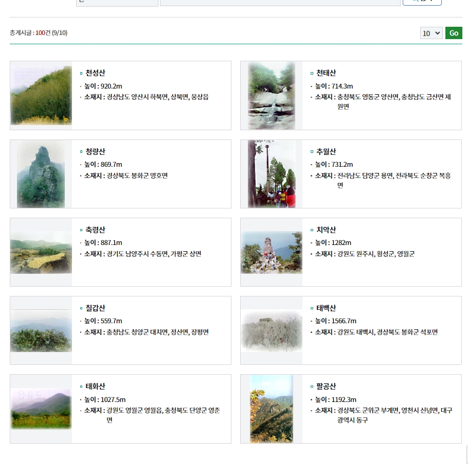 해당 홈페이지로 들어와서 가장 좋은 기능이라고 생각했습니다. 한반도 지도 모양 그대로 100개 산을 표시하면 사실 산이 어디있는지 알수도 없을 정도로 겹쳐 보여서 어디가 어딘지 하나도 구분이 가지 않는데 해당 페이지는 도별로 확인이 가능합니다.