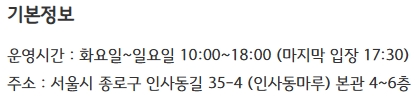 뮤지엄김치간을 찾아가는 길도 어렵지 않아요. 지하철을 이용하는 것이 가장 편리한 방법인데요. 3호선 안국역 6번 출구로 나와서 인사동길 안쪽으로 쭉 걸어오시면 '인사동마루'라는 건물이 보일 거예요. 뮤지엄김치간은 바로 그 건물 4층, 5층, 6층에 자리하고 있답니다. 인사동 구경도 하면서 천천히 걸어오다 보면 금방 찾으실 수 있을 거예요.