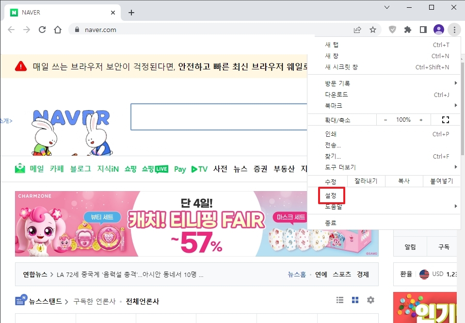 크롬 브라우저 네이버 시작페이지 설정