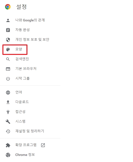 설정 창에 들어오면 화면이 좀 복잡해 보일 수 있어요. 당황하지 마시고, 왼쪽 메뉴들을 보세요. '나와 Google의 관계', '자동 완성' 등이 보이죠. 우리는 '모양' 탭을 누를 거예요.