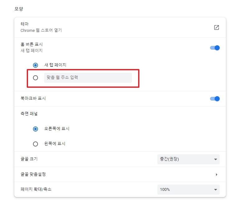 '모양' 탭에 들어오면 '홈 버튼 표시'라는 옵션이 보일 거예요. 이게 만약 꺼져 있다면, 일단 파란색 스위치를 눌러서 활성화시켜야 해요. 홈 버튼 자체가 없으면 시작페이지도 의미가 없으니까요.
