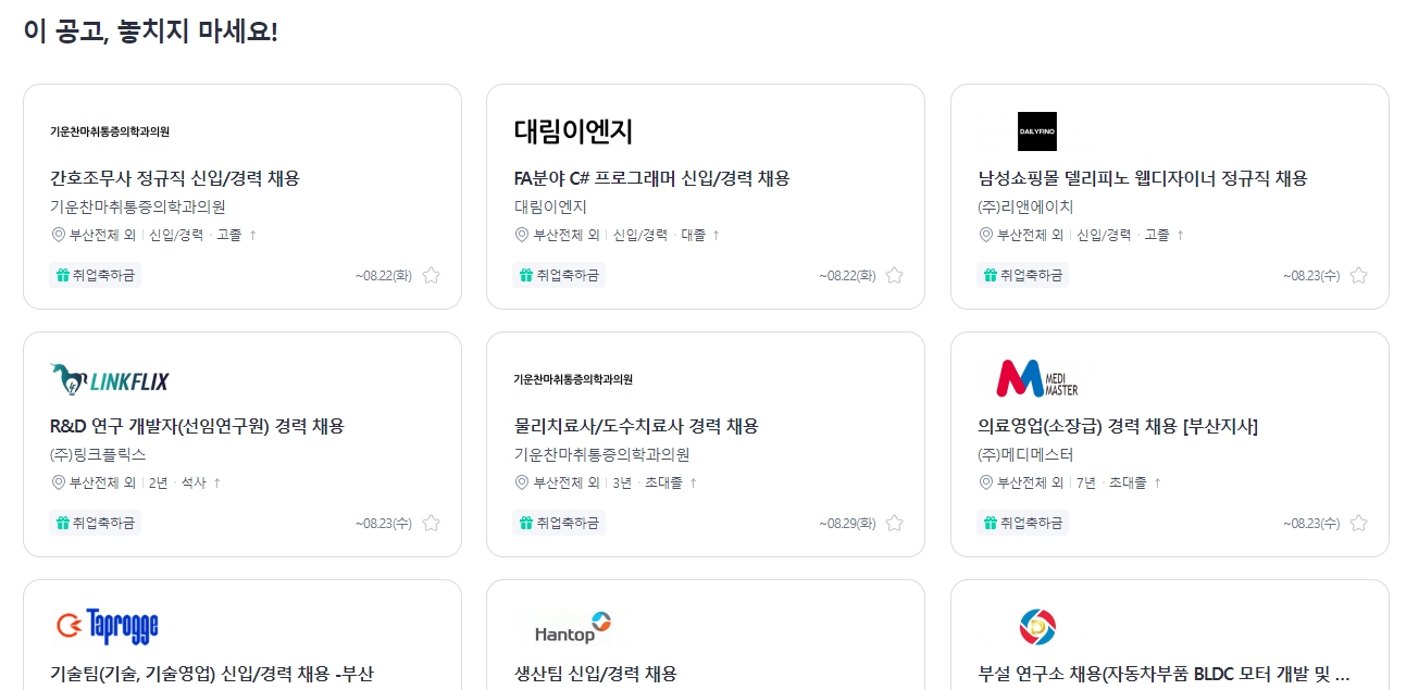 부산 전체로 설정하고 나면 이렇게 채용 공고 리스트가 나와요. 자세히 보시면 '프리미엄', '플래티넘' 이런 식으로 구분이 되어있죠.