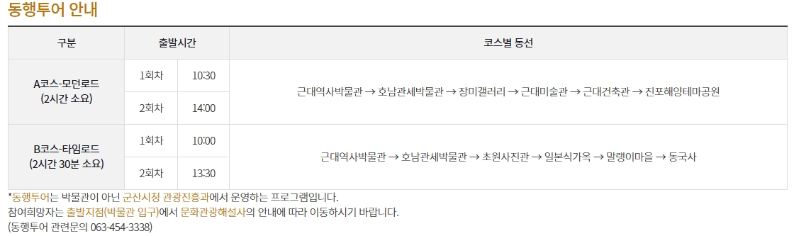 출발 시간이 정해져 있으니 시간에 맞춰서 박물관 입구에 있는 출발장소로 가시면 돼요. A코스는 오전 10시 30분과 오후 2시에, B코스는 오전 10시와 오후 1시 30분에 출발하네요. 근대역사박물관부터 시작해서 진포해양테마공원이나 동국사까지 둘러보는 알찬 코스이니, 시간만 맞으면 참여해보시는 걸 정말 추천드려요.댓글