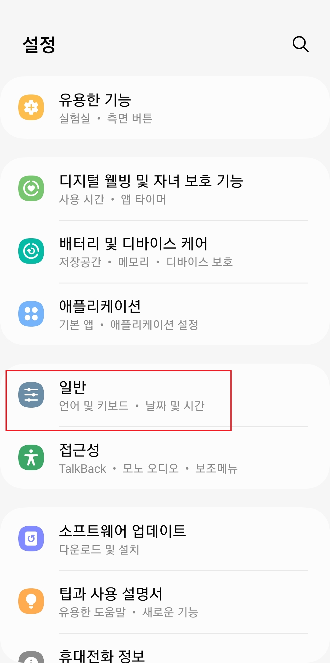 설정창에 들어오셨으면 스크롤을 쭉 내려서 '일반' 메뉴를 찾아야 해요. '계정 및 백업' 바로 위에 있거나 기종마다 조금씩 위치는 달라도, '언어 및 입력 방식', '날짜 및 시간' 같은 기본 기능들이 모여있는 곳이에요.