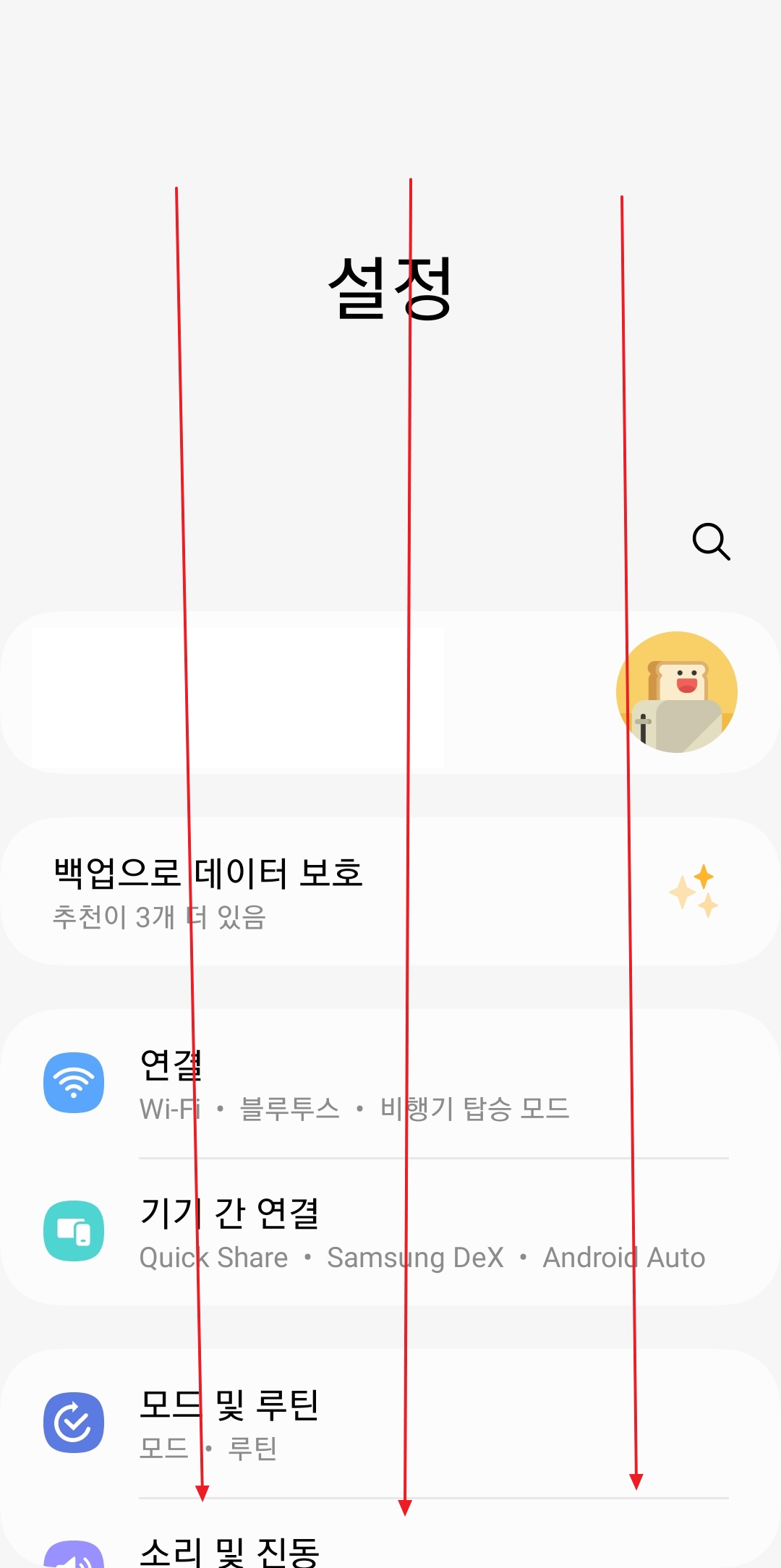 가끔 이 '설정' 아이콘을 못 찾아서 헤매는 분들이 계시더라고요. 그럴 땐 화면 맨 위를 쓸어내려서 나오는 빠른 설정창 있죠? 거기 오른쪽 위에도 톱니바퀴가 있으니 그걸 누르셔도 똑같이 들어갈 수 있어요. 괜히 앱 서랍 다 뒤지지 마세요.