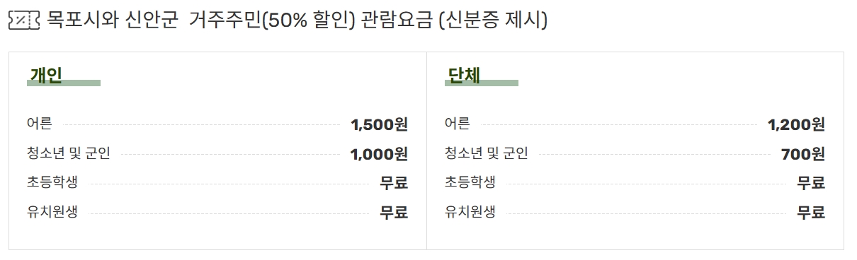 혹시 목포시나 신안군에 사는 분들은 훨씬 더 싸게 구경할 수 있어요. 무려 50%나 할인을 해주거든요. 신분증을 꼭 챙겨가서 보여줘야 할인을 받을 수 있다는 점 잊지 마세요.