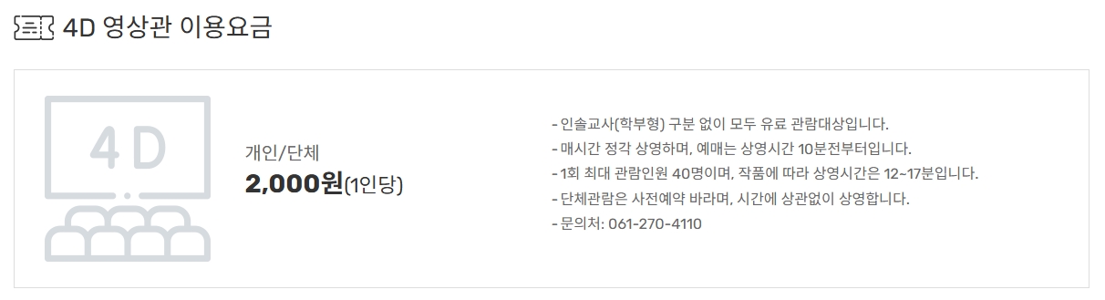 매 시간 정해진 시간에만 영화를 보여주고, 영화 시작하기 10분 전부터 표를 살 수 있다고 하네요. 한 번에 40명까지만 들어갈 수 있고, 상영되는 작품에 따라서 영화 길이는 12분에서 17분 정도래요. 단체로 보려면 미리 전화해서 예약을 해야 기다리지 않고 바로 볼 수 있으니 참고하세요. 문의는 061-270-4110으로 하시면 됩니다.