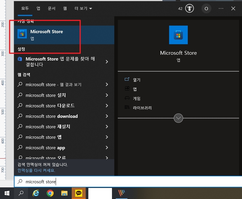 검색창이 열리면 입력란에 영문으로 'Microsoft Store'라고 적거나 한글로 '스토어'라고 입력해 주세요. 그러면 쇼핑백 모양의 아이콘이 뜬금없이 나타날 텐데요, 이게 바로 스마트폰의 앱스토어 같은 역할을 하는 곳입니다.