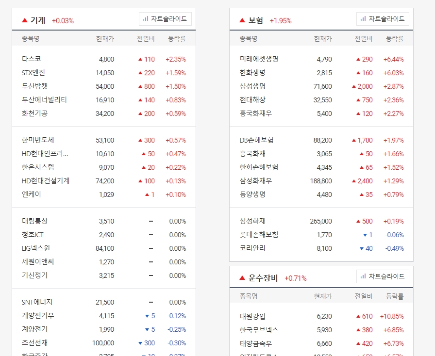 카테고리를 선택하면 단순히 종목명만 나열되는 것이 아니라, 업종별/테마별로 정리된 시세 현황을 볼 수 있습니다. 이렇게 보면 오늘 하루 어떤 산업군이 주도하고 있는지 색깔만 봐도 직관적으로 알 수 있거든요.
