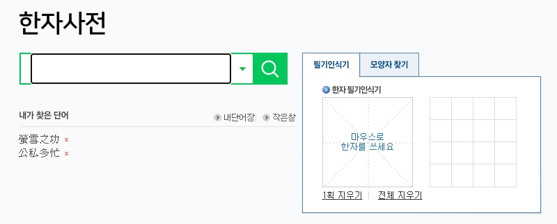 제가 가장 즐겨 쓰고 강력하게 추천해 드리는 기능은 바로 필기 인식 기능이에요. 한자의 음을 안다면 타자로 치면 그만이지만, 사실 모르는 글자를 찾으려고 사전을 켜는 경우가 훨씬 많잖아요? 그럴 때는 마우스나 손가락으로 글자를 그림 그리듯이 슥슥 그려주시면 됩니다.