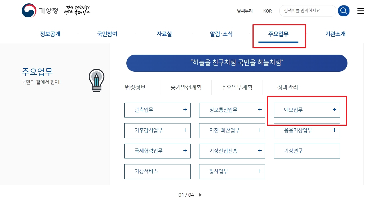 페이지가 이동했다면 이제 메뉴를 순서대로 찾아가야 하는데요, 이 과정이 은근히 복잡하게 느껴지실 수 있어요. 상단 메뉴바에서 [주요업무]를 먼저 누르시고, 그 아래 나오는 [예보업무]를 선택한 다음, 마지막으로 [기상정보 및 특보] 순서로 클릭해서 들어가시면 된답니다.
