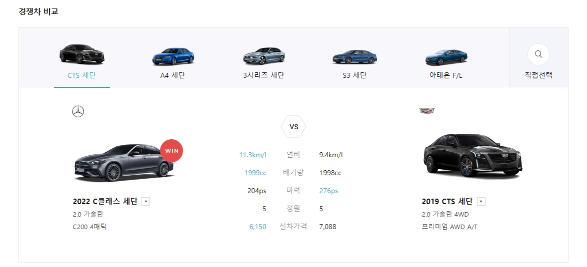 그리고 페이지 하단을 보면 아주 유용한 기능이 하나 더 있는데요. 바로 '경쟁차 비교' 코너입니다. 보통 벤츠를 고민하시는 분들은 BMW나 아우디, 캐딜락 같은 경쟁사 모델도 같이 염두에 두고 계시잖아요?