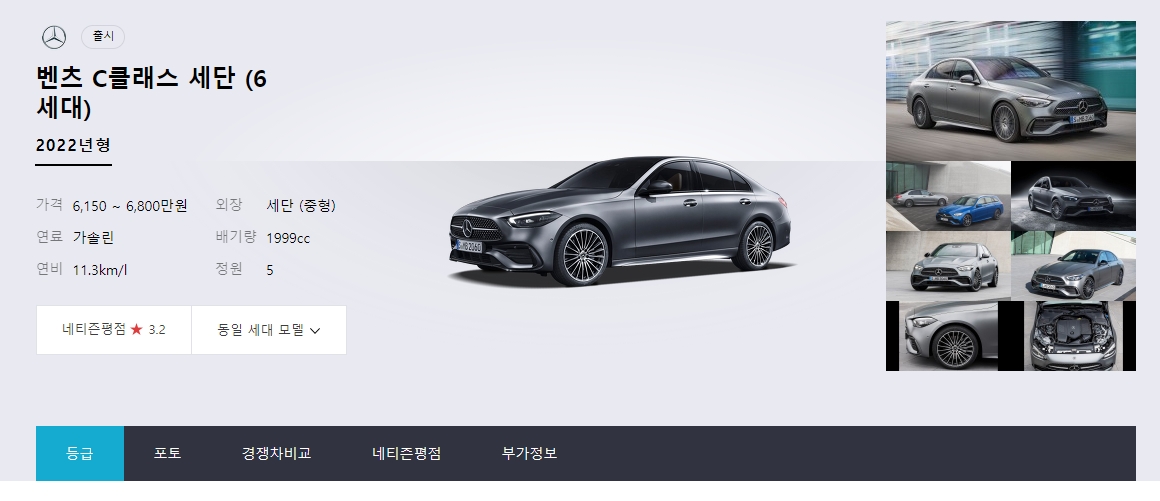 차량의 외관 디자인도 크게 볼 수 있고, 전체적인 출시가 범위가 나오는데요. 하지만 여기서 끝이 아니죠. 같은 C클래스라도 트림에 따라 가격이 천차만별이니 스크롤을 더 내려서 세부 내용을 확인해야 해요.