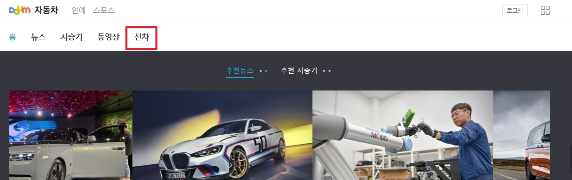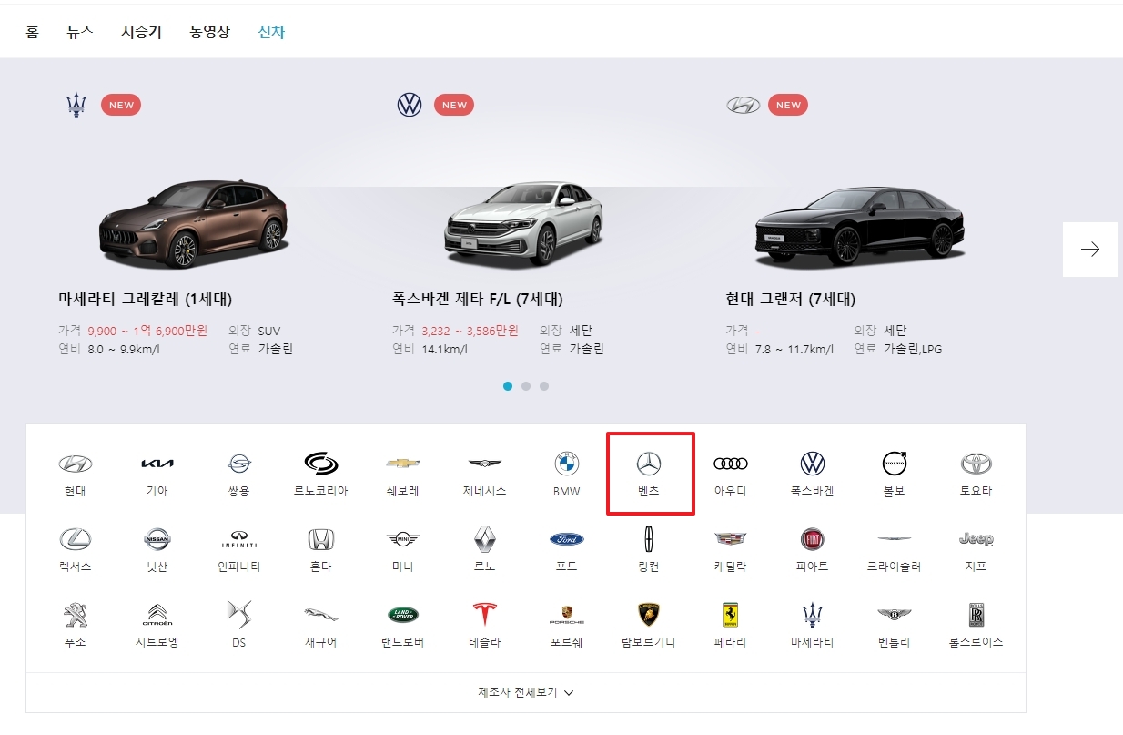 자동차 페이지에 들어오셨다면 상단에 여러 가지 메뉴들이 쭉 나열되어 있는 게 보이실 텐데요. 저희는 중고차가 아니라 새 차의 가격을 알아보려는 거니까, 망설이지 말고 신차 메뉴를 클릭해 주시면 됩니다.