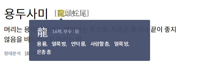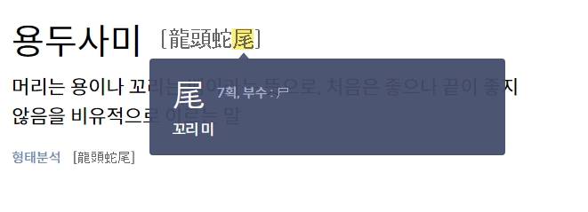 검색창에 단어를 입력해보니 바로 결과가 나오네요. 사전적 정의를 보면 '머리는 용이고 꼬리는 뱀'이라는 뜻이 명확하게 적혀 있어요. 처음에는 기세가 대단하고 훌륭하지만, 나중에는 보잘것없어지는 경우를 비유적으로 이르는 말이죠.
