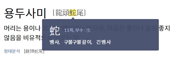 검색창에 단어를 입력해보니 바로 결과가 나오네요. 사전적 정의를 보면 '머리는 용이고 꼬리는 뱀'이라는 뜻이 명확하게 적혀 있어요. 처음에는 기세가 대단하고 훌륭하지만, 나중에는 보잘것없어지는 경우를 비유적으로 이르는 말이죠.