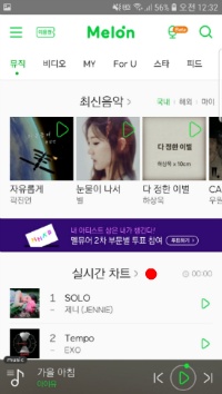가장 먼저 하셔야 할 일은 멜론 앱을 켜고 내가 확인하고 싶은 노래를 찾는 거예요. 보통 실시간 차트에 있는 곡이라면 찾기가 쉬운데, 차트에 없다면 검색 기능을 이용하셔도 전혀 상관없습니다. 저는 예시로 차트에 있는 곡을 하나 골라서 진행해 봤는데, 팬분들이라면 보통 '스밍 리스트'를 만들어두고 계속 듣고 계실 테니 플레이리스트에서 바로 접근하셔도 됩니다.