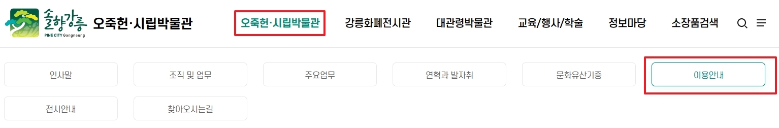 강릉 오죽헌시립박물관에 방문하시려면 먼저 운영시간이나 입장료 같은 정보들을 미리 확인하고 가시는게 좋잖아요. 이런 정보들은 공식 홈페이지에 잘 나와있는데요, 홈페이지에 들어가셔서 '오죽헌·시립박물관' 메뉴를 누르시고 오른쪽에 보이는 '이용안내' 버튼을 클릭하시면 관련 정보를 쉽게 찾아보실 수 있어요. 다른 여러가지 메뉴들도 많지만 입장료나 시간 같은 건 이용안내에 다 들어있답니다.