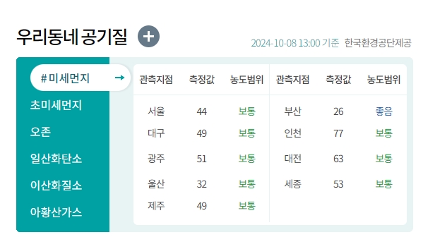 요즘 미세먼지 없는 날이 드물 정도로 대기질이 중요해졌잖아요. 에어코리아와 연동된 지도를 통해 우리 동네 공기 상태를 실시간으로 체크할 수 있어요.
