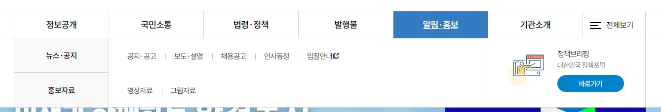 가장 따끈따끈한 소식을 접하고 싶다면 알림/홍보 마당을 수시로 확인해 보세요. 새로운 정책 발표나 보도자료가 실시간으로 업데이트되는 공간이거든요.