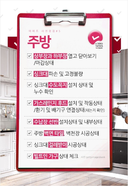 주방은 수납장 문을 모두 열었다 닫았다 해보는 게 필수예요. 경첩이 헐겁지는 않은지, 서랍이 부드럽게 열리는지 확인하세요. 싱크대 상판에 흠집이나 오염이 없는지도 꼼꼼히 보셔야 하고요.