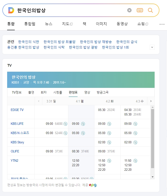 포털 사이트 검색 결과에 재방송 편성 정보가 나타나지 않는 화면