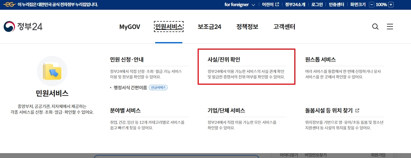 메인 화면 상단을 보시면 '서비스', '보조금24' 등 여러 메뉴가 있는데, 그중에서 [민원서비스]에 마우스를 올려보세요. 그러면 하위 메뉴들이 주르륵 나오는데, 여기서 사실/진위 확인이라는 항목을 찾아 들어가시면 됩니다.