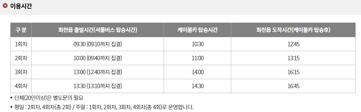 - 셔틀버스 탑승 시간과 케이블카 탑승 시간이 표 형식으로 정리돼 있어요.