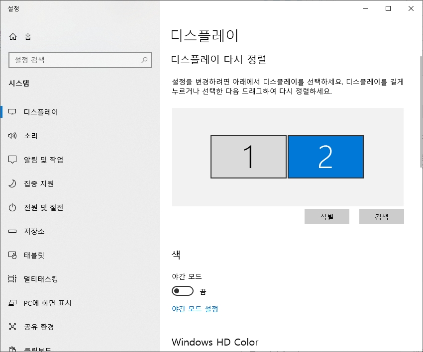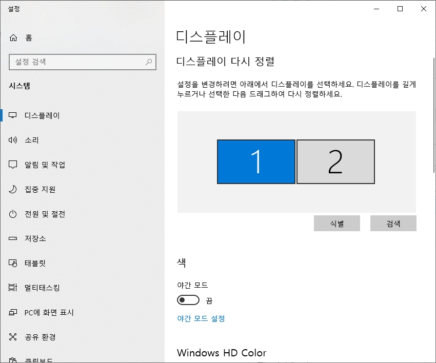 요즘은 모니터를 두 개씩 쓰는 듀얼 모니터 환경도 흔하잖아요? 이럴 때는 설정 창 상단에 1번, 2번 네모 박스가 뜰 거예요. 조절하고 싶은 모니터를 클릭한 다음 설정을 바꿔야 해당 화면만 바뀐다는 점, 꼭 기억하셔야 해요.