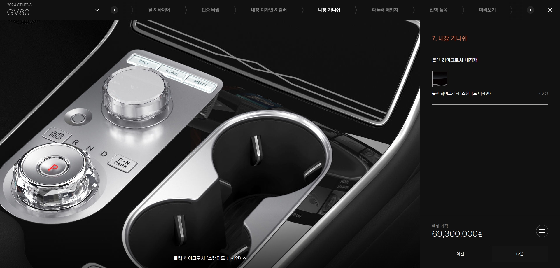 모든 선택을 마치면 내가 구성한 차량의 내외관을 360도로 돌려보면서 확인할 수 있어요. 색상 매치가 잘 되었는지, 휠 디자인은 어울리는지 마지막으로 점검하는 단계죠.