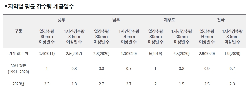 전국적으로는 2020년에 일강수량이 80mm 이상인 날이 2.9일, 1시간강수량이 30mm 이상인 날이 1.9일이었어요. 30년 평균을 보면 중부 지역은 일강수량 80mm 이상인 날이 1일, 1시간강수량 30mm 이상인 날이 0.8일이에요. 남부 지역은 각각 0.8일과 0.7일, 제주도는 1일과 0.8일, 전국 평균은 각각 0.9일과 0.7일이에요.