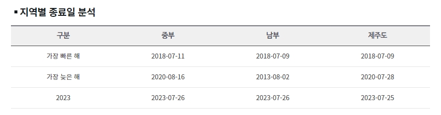 9. 중부지방의 장마 종료일은 가장 빠른 해가 2018년 7월 11일, 가장 늦은 해는 2020년 8월 16일입니다. 남부지방은 가장 빠른 해가 2018년 7월 9일, 가장 늦은 해는 2013년 8월 2일입니다. 제주도는 가장 빠른 해가 2018년 7월 9일, 가장 늦은 해는 2020년 7월 28일입니다. 2023년의 경우, 중부와 남부지방은 7월 26일, 제주도는 7월 25일에 장마가 종료되었습니다.