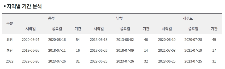 10. 중부지방의 최장 장마 기간은 2020년 6월 24일부터 8월 16일까지 54일간 지속되었고, 최단 장마 기간은 2018년 6월 26일부터 7월 11일까지 16일이었습니다. 남부지방의 최장 기간은 2013년 6월 18일부터 8월 2일까지 46일, 최단 기간은 2018년 6월 26일부터 7월 9일까지 14일이었습니다. 제주도의 최장 기간은 2020년 6월 10일부터 7월 28일까지 49일, 최단 기간은 2021년 7월 3일부터 7월 19일까지 17일이었습니다. 2023년의 장마 기간은 중부지방 31일, 남부지방 32일, 제주도 31일이었습니다.
