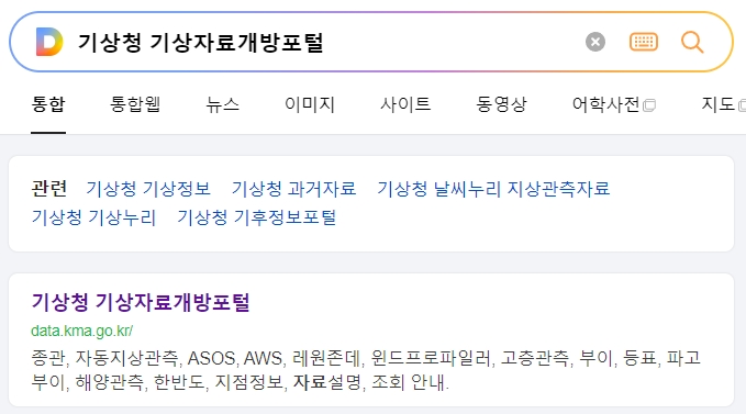 1. 기상청 기상자료개방포털 홈페이지에 접속합니다. 이 포털은 종관, 자동지상관측, ASOS, AWS, 레원존데, 윈드프로파일러, 고층관측, 부이, 등표, 파고부이, 해양관측 등 다양한 기상 관측 자료와 한반도의 지점 정보를 제공하는 사이트입니다.