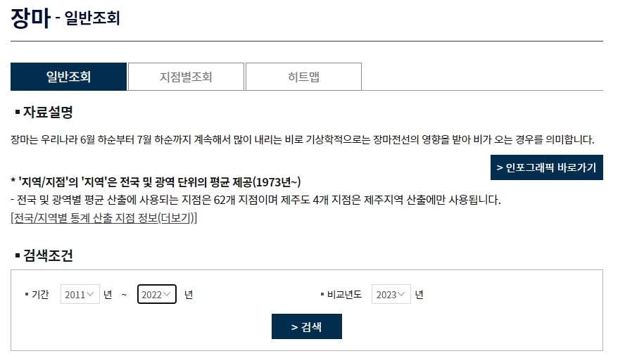 2. 상단의 메뉴에서 '기후통계분석'을 클릭한 후, '통계분석'을 선택하고 '장마'를 클릭합니다.