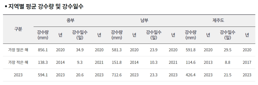 7. 2023년 중부지방의 강수량은 594.1mm, 남부지방은 712.6mm, 제주도는 426.4mm였습니다. 강수일수는 중부지방이 20.6일, 남부지방이 23.3일, 제주도가 21.5일이었습니다. 2020년은 가장 많은 강수량을 기록한 해로, 중부지방 856.1mm, 남부지방 581.3mm, 제주도 591.8mm였습니다.