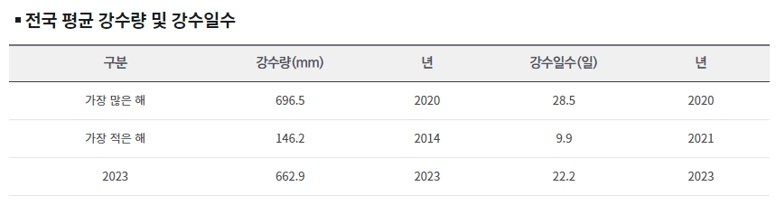 6. 전국적으로 평균 강수량은 2023년에 662.9mm였으며, 평균 강수일수는 22.2일로 나타났습니다. 가장 많은 강수량을 기록한 해는 2020년으로, 696.5mm였습니다. 가장 적은 강수량을 기록한 해는 2014년으로, 146.2mm였습니다.