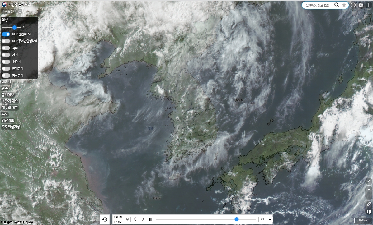 메뉴를 클릭하면 위성 영상을 볼 수 있는 지도가 나타납니다. 여기서 좌측에 있는 날씨 지도 옵션을 선택하면 현재 한반도 주변의 구름 분포를 아주 상세하게 확인할 수 있습니다.