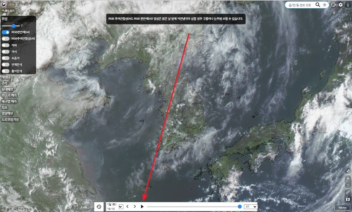 이 기능의 꽃은 바로 재생 기능입니다. 화면 하단에 있는 재생 버튼을 누르면 최근 몇 시간 동안 구름이 어느 방향으로 움직였는지 아주 생생하게 보여주거든요.