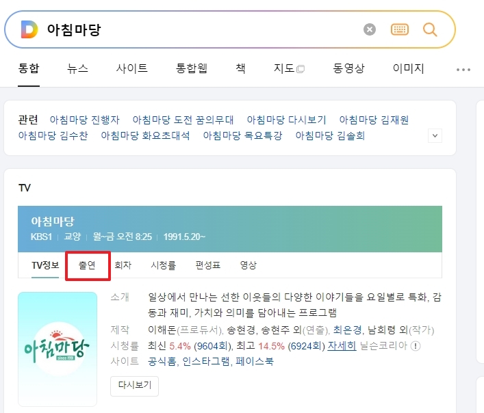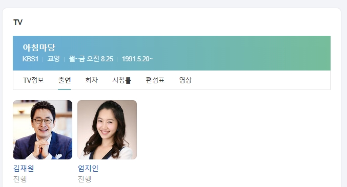 포털 검색창에 아침마당 진행자를 찾아보시면 방송에 대한 자세한 정보가 쭉 나옵니다. 여기서 출연진 탭을 눌러보면 지금 프로그램을 이끌고 있는 두 분의 반가운 얼굴을 바로 확인할 수 있습니다.