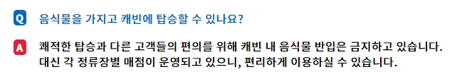 마지막으로 탑승 시 꼭 지켜주셔야 할 기본 매너가 있습니다. 다른 탑승객들에게 냄새나 불쾌감을 줄 수 있기 때문에 캐빈 안으로는 어떠한 음식물도 가지고 들어가실 수 없습니다. 쾌적한 환경을 위해 다 같이 지켜야 할 약속이죠.