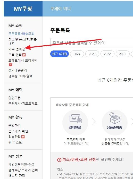 로그인을 하셨다면 화면 오른쪽 위에 있는 마이쿠팡 메뉴를 눌러주시면 됩니다. 페이지가 넘어가면 왼쪽 메뉴 목록 중에서 와우 멤버십 항목을 찾아 클릭해 주세요. 여기서 모든 관리가 이루어진답니다.